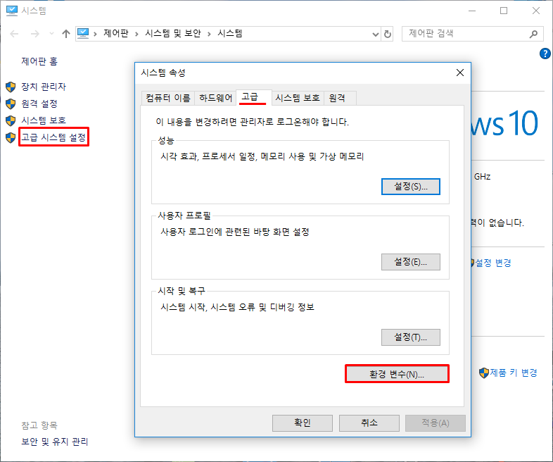 '고급'탭의 '환경 변수(N)...' 으로 들어갑니다.