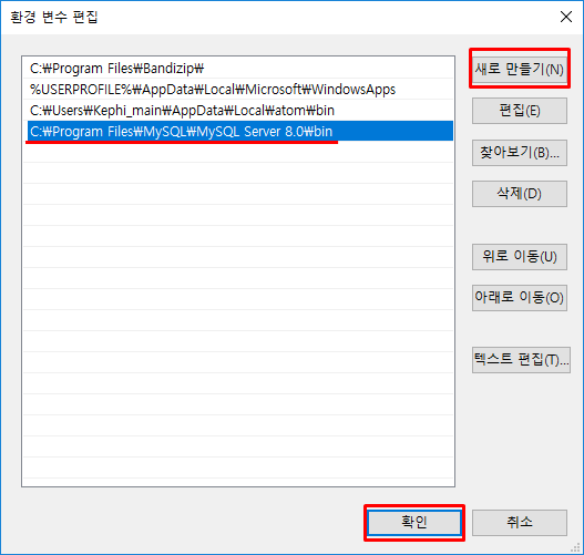 3. '새로 만들기(N)' 을 클릭해서 아래 그림과 같이 MySQL 이 설치된 경로를 입력 후 확인을 누릅니다.