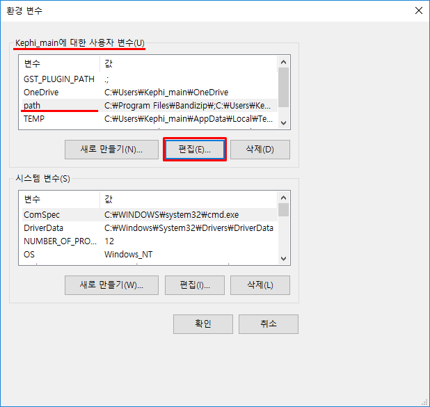 2. 사용자 변수의 'path'를 선택해서 '편집(E)...' 로 들어갑니다.