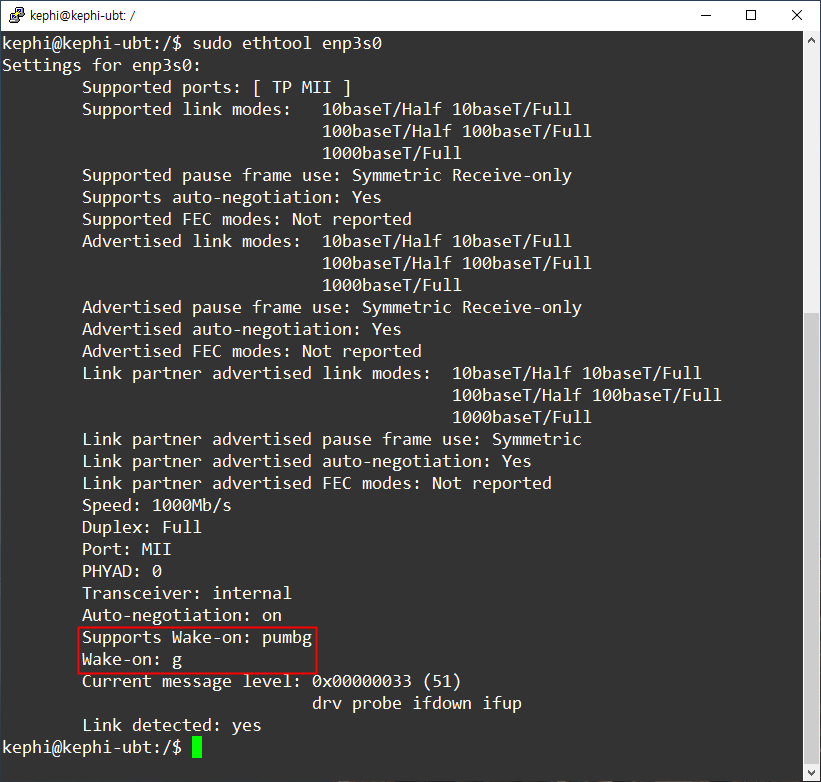 - 만약 Wake-on 항목이 g 가 아닌 다른 값이라면, 아래 명령어로 WOL 기능을 활성화 합니다.