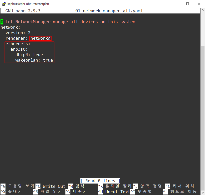 # Let NetworkManager manage all devices on this system network: version: 2 renderer: networkd ethernets: 인터페이스이름: dhcp4: no dhcp6: no wakeonlan: true addresses: 아이피 주소 대역 (ex [192.168.0.100/24]) ","로 구분하여 여러개 가능 gateway4: 게이트웨이4 주소 (ex 192.168.0.255) nameservers: addresses: 네임서버DNS 주소 대역 ([8.8.8.8,8.8.4.4]) "," 로 구분하여 여러개 가능 |