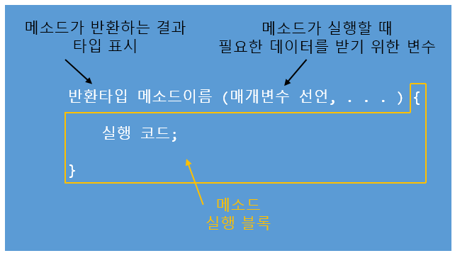 선언부(반환타입, 메소드 이름, 매개 변수 선언) 와 실행 블록으로 구성된다.