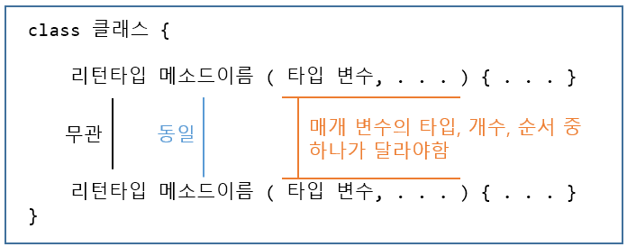 클래스 내에 같은 이름의 메소드를 여러 개 선언하는 것.