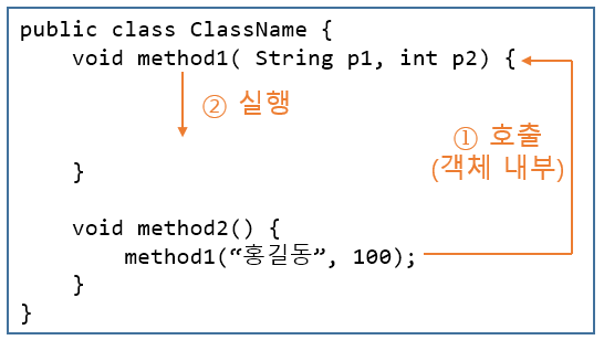 메소드를 호출하게 되면 중괄호 블록에 있는 코드들이 일괄적으로 수행된다.