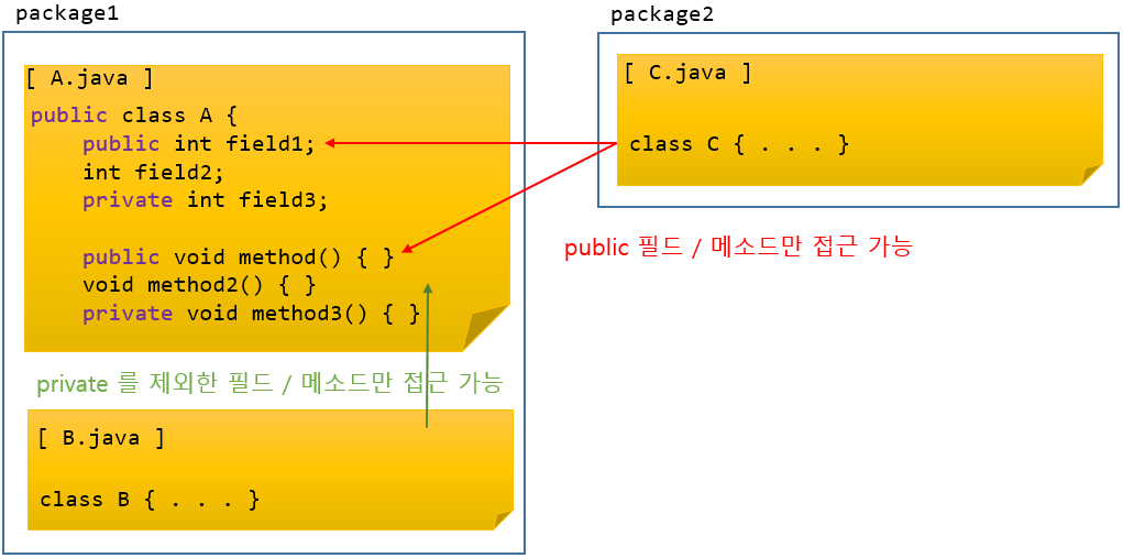 public / private 를 생략했다면, default 접근 제한을 갖는다. 같은 패키지에서만 필드, 메소드 사용 가능 다른 패키지에서는 필드, 메소드 사용 불가 |
