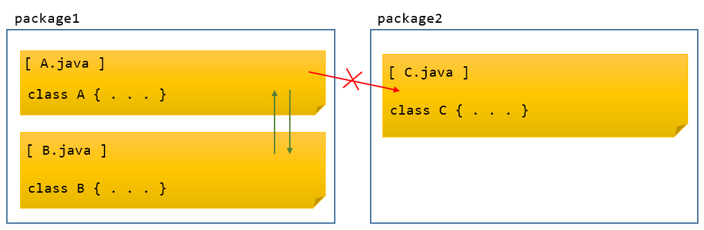 같은 패키지에서는 아무런 제한 없이 사용, 다른 패키지에서는 사용 불가