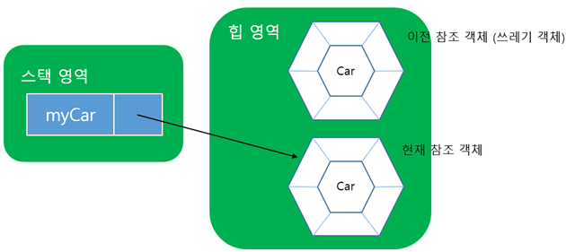 Car myCar = new Car(); // 이전 참조 객체 (쓰레기 객체가 되어버림)